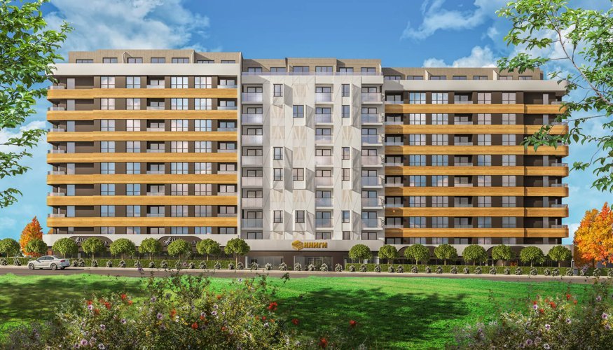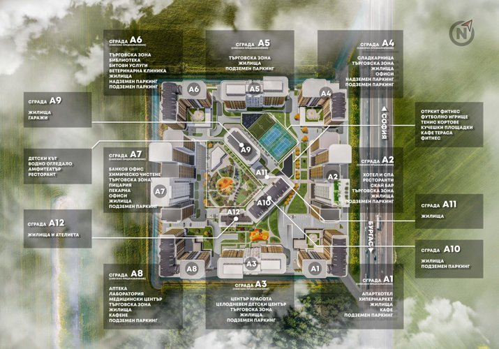 „Азимут“ - единственный в своем роде комплекс в городе с ухоженной озелененной территорией общей площадью 68000 кв.м. Здесь Вы будете наслаждаться однотипной постройке из 12-ти впечатляющих зданий на одной территории, соответствующих самым высоким стандартам современного строительства и предлагающих все, в чем нуждается современный человек. Здесь будет создана идеальная среда для жизни и работы: дневной детский центр, салон красоты, кондитерская, книжный магазин, продуктовый и магазин промтоваров, торговая зона для бизнеса, мед. лаборатория, рестораны, фитнес, футбольная площадка, ветклиника, площадка для выгула собак, банковский офис, химчистка, аптека, медицинский центр, а прекрасные зеленые территории комплекса будут предоставлять Вам приятную окружающую среду.