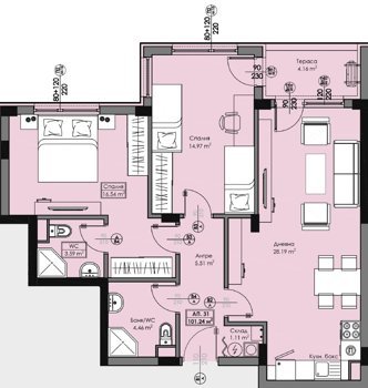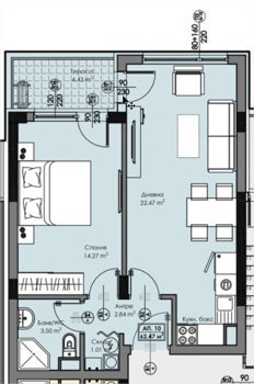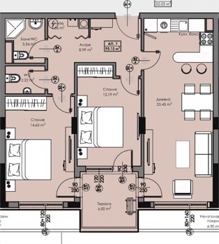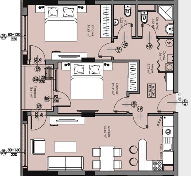 Основная масса квадратных метров всей квартиры отдана просторным и светлым жилым комнатам с большими панорамными окнами.