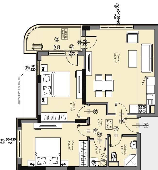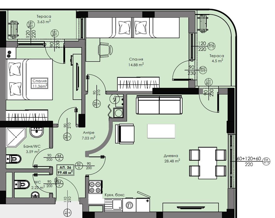 Большой выбор трехкомнатных квартир, среди них квартиры с просторными панорамными террасами, и с собственными зелеными двориками.